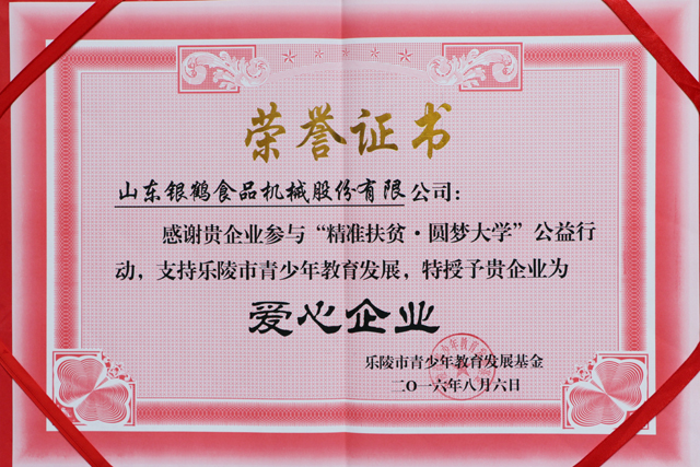 2016年8月6日,山东银鹤食品机械股份有限公司参与“精准扶贫 圆梦大学”公益行动,支持乐陵市青少年教育发展,被授予“爱心企业”。
