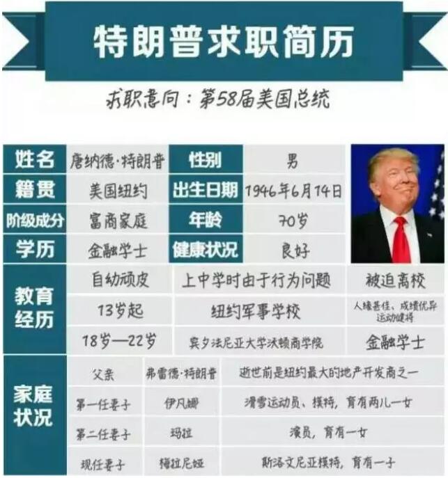 170岁的唐纳德特朗普将担任美国第58届总统!令人不可思议的事是,特朗普的身份是一位“政治白丁”,22岁拿到金融学士学位,就职于父亲的房地产公司,凭借自己的新颖策略,先后改造、修建几座豪华酒店,成为金字塔顶端人士。