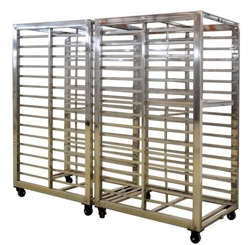 单开门智能蒸房内带蒸房小车1辆;蒸房小车可放置32个托盘;托盘之间的高度是10CM;托盘尺寸是50X70X5CM